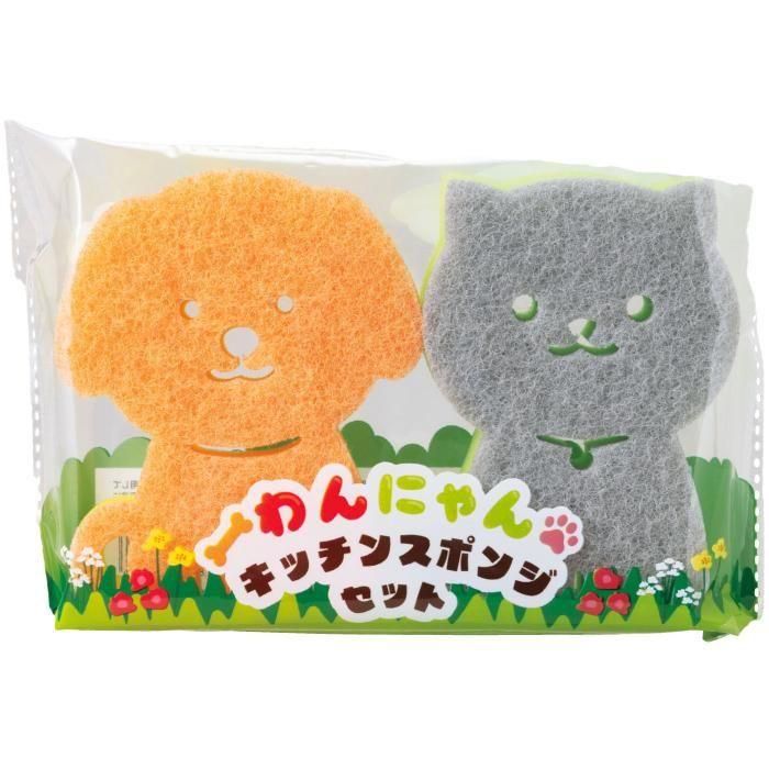 わんちゃんとねこちゃんがかわいい!厚みのある2層構造のキッチンスポンジ2個セットです。