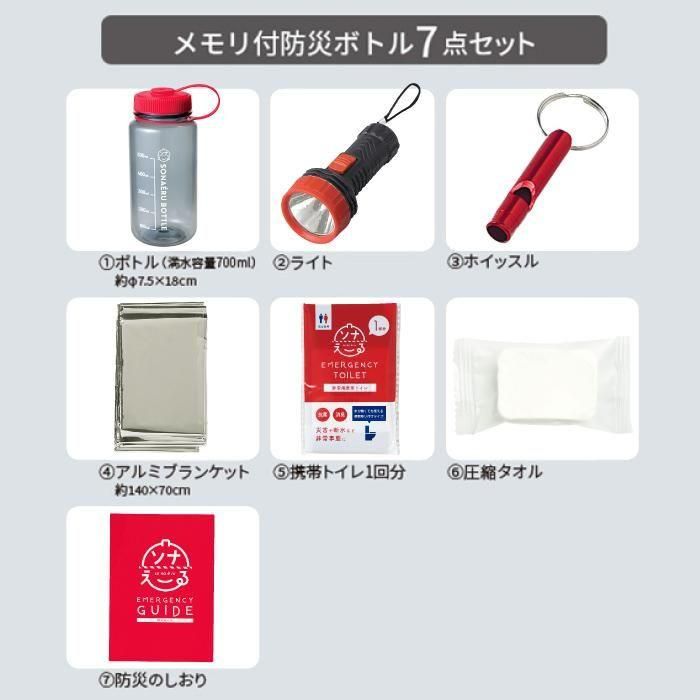 ■セット内容:ボトル(容量700ml)・ホイッスル・アルミブランケット140×70cm・携帯トイレ1回分・圧縮タオル・防災しおり・ライト/単三乾電池2本使用(別途)